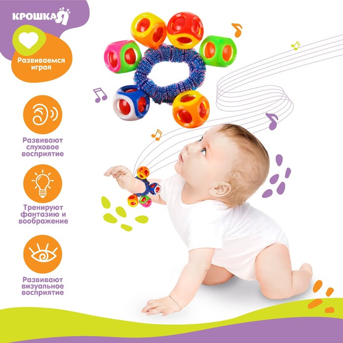 Погремушка — это первая игрушка малыша. Красочный предмет знакомит новорождённого с окружающим миром. Он развивает у ребёнка пространственное мышление, а также слуховое, зрительное и тактильное восприятие.