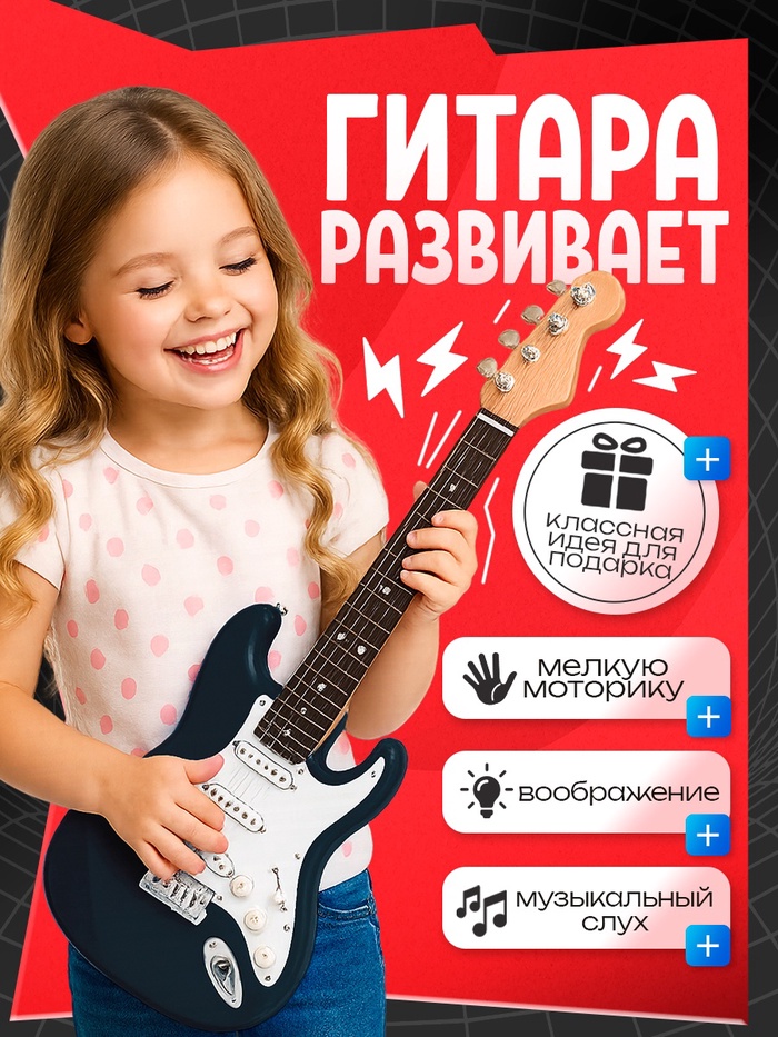 С музыкальной гитарой ребёнок раскроет творческий потенциал, научится соотносить свои действия с результатом и контролировать движения рук, а также потренирует чувство ритма и моторику пальчиков.