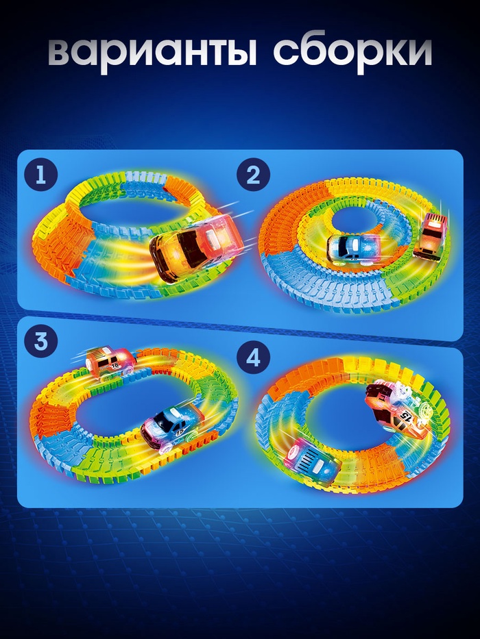 Автотрек Flash Track — это набор для зрелищных заездов. Трассу можно собрать не просто так, чтобы она поворачивала и петляла в разные стороны, но также сделать выпуклой или вогнутой или вообще закольцевать, заставив машинку ездить внутри неё.