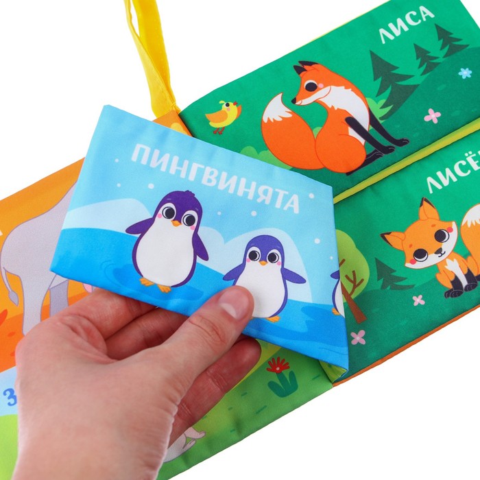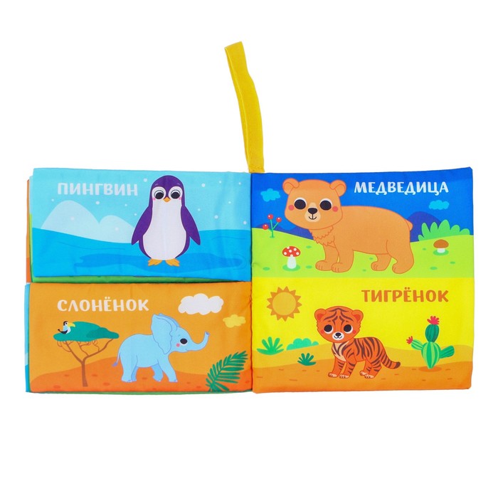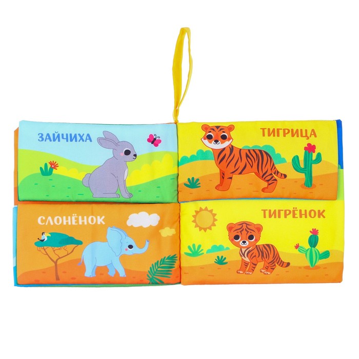 - Книжка выполнена из мягкого текстиля с шуршащими элементами для тактильного и звукового развлечения.