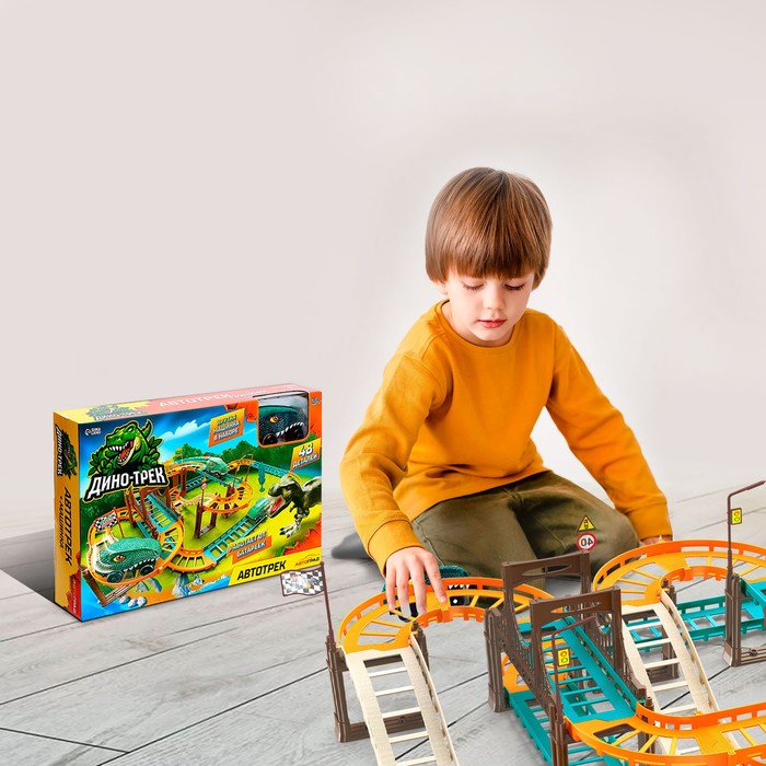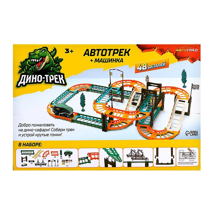 Автотрек «Динотрек» — это набор для зрелищных заездов. Трассу можно собирать как угодно. На коробке представлен вариант сборки. В комплекте одна машинка.