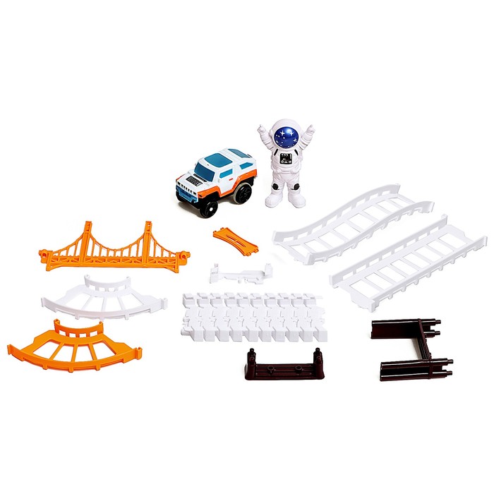 Автотрек «Космотрек» — это набор для зрелищных заездов. Трассу можно собирать как угодно. На коробке представлен вариант сборки. В комплекте одна машинка и фигурка космонавта.