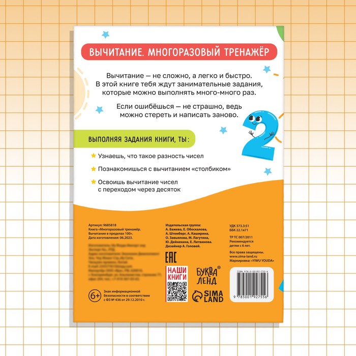 Многоразовый тренажёр — удобный инструмент для дошкольной подготовки деток. С данной книгой ребёнок обучится арифметике, а именно изучит вычитание.