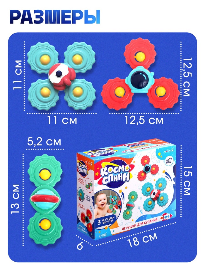 Набор из трех разноцветных спиннеров на присосках «Космо-спин» станет отличным выбором для игр в ванной. Эти игрушки понравятся детям от 1 года, превращая купание в увлекательное приключение. Игрушки легко крепятся к любой гладкой поверхности благодаря прочным присоскам.