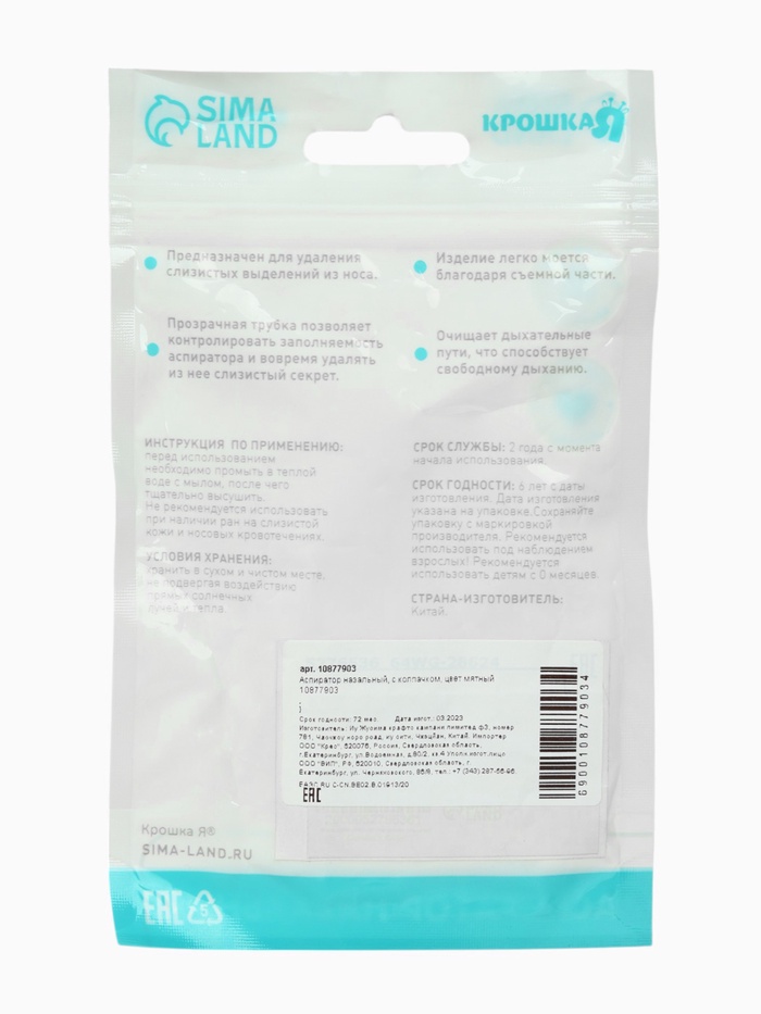 Аспиратор назальный, с колпачком, цвет мятный