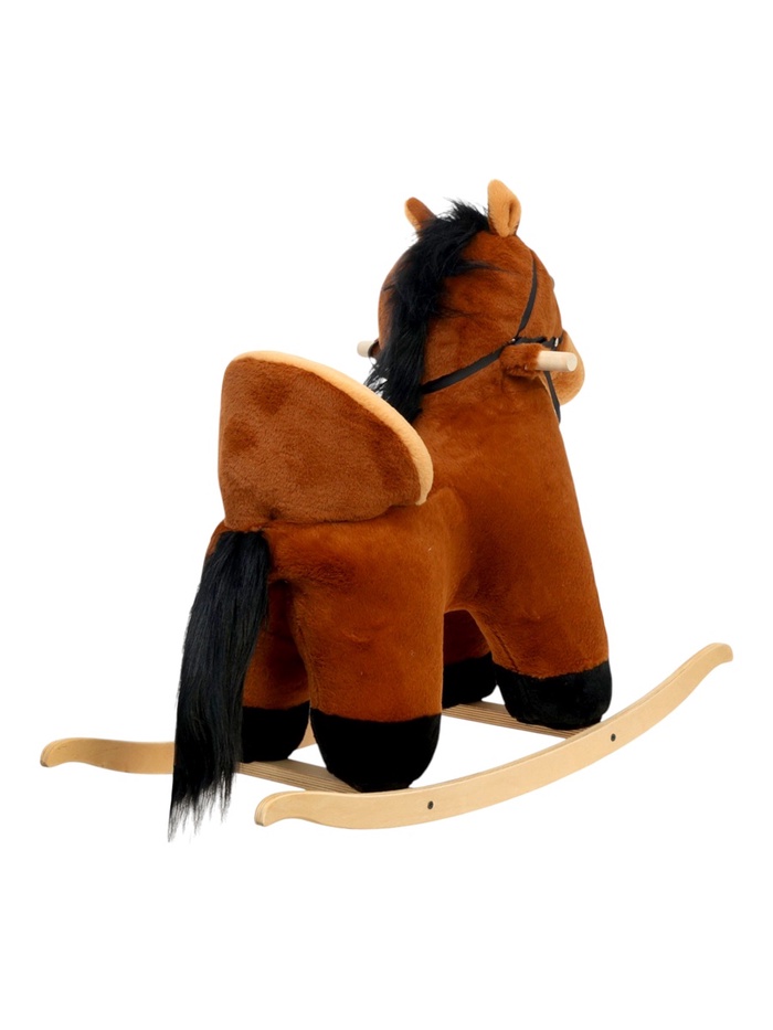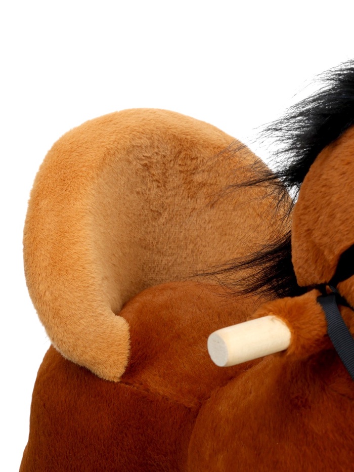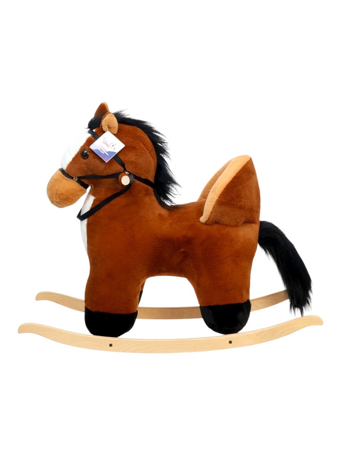 Игрушка выполнена в виде красивой лошадки с мягким корпусом, гривой, хвостом и удобными ручками. Спинка делает посадку более комфортной и помогает ребёнку чувствовать себя увереннее во время катания. Деревянные полозья обеспечивают устойчивое и плавное качание.