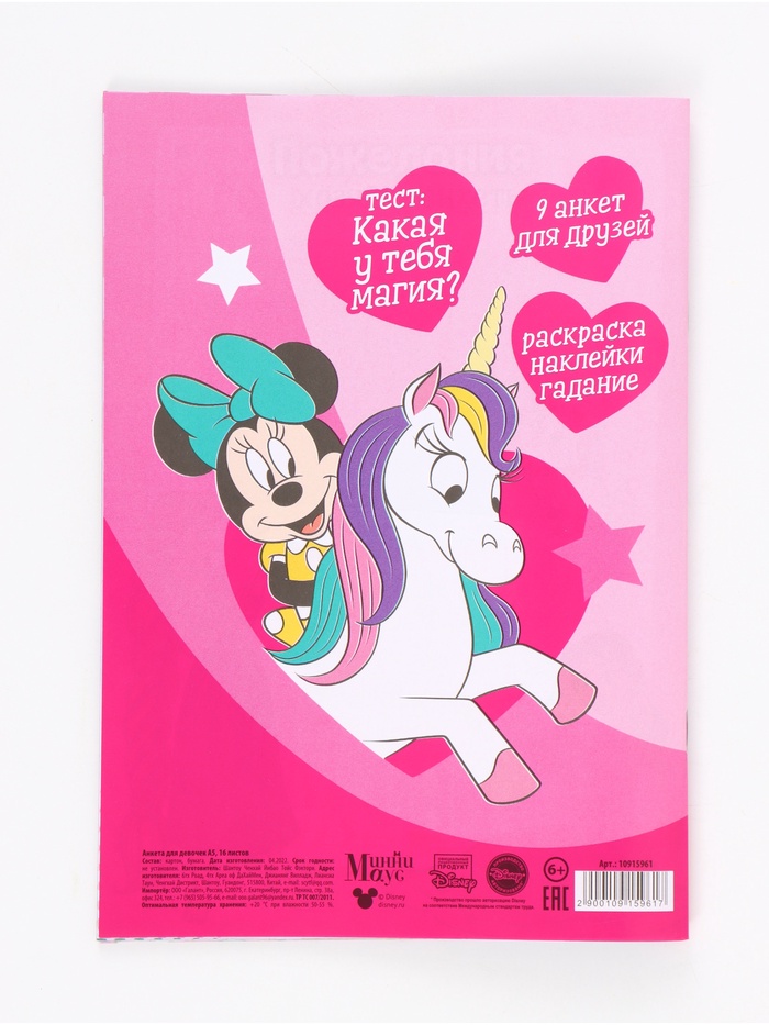 Анкета для девочек А5, 16 л + наклейки "Минни Маус"
