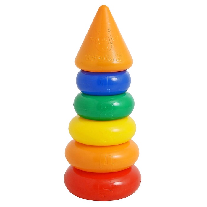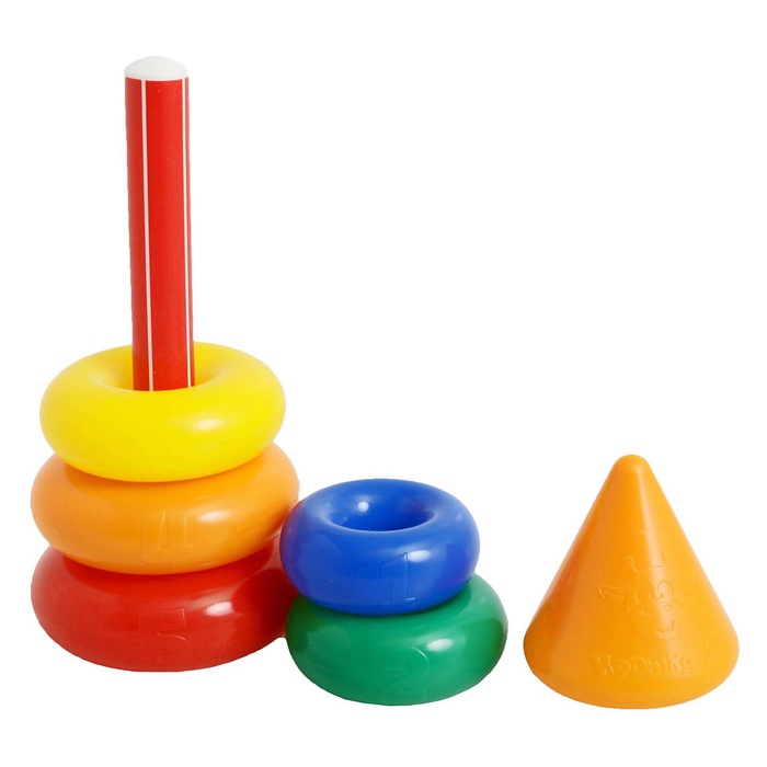 Каждое кольцо разного цвета и пронумеровано. Собирая пирамидку, ребёнок освоит основные цвета радуги и получит базовые навыки счёта. Игры с красочной пирамидкой разовьют у крохи мелкую моторику, координацию движений, воображение, логическое и образное мышление, навыки конструирования. Он научится различать предметы по величине, сравнивать их и делать выводы. Также юный конструктор познакомится с такими понятиями, как «больше», «меньше», «круг», «конус», «плоский», «объёмный».