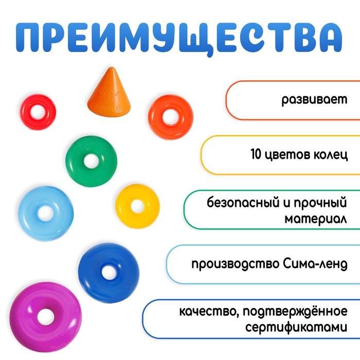 Каждое кольцо разного цвета и пронумеровано. Собирая пирамидку, ребёнок освоит основные цвета радуги и получит базовые навыки счёта. Игры с красочной пирамидкой разовьют у крохи мелкую моторику, координацию движений, воображение, логическое и образное мышление, навыки конструирования. Он научится различать предметы по величине, сравнивать их и делать выводы. Также юный конструктор познакомится с такими понятиями, как «больше», «меньше», «круг», «конус», «плоский», «объёмный».